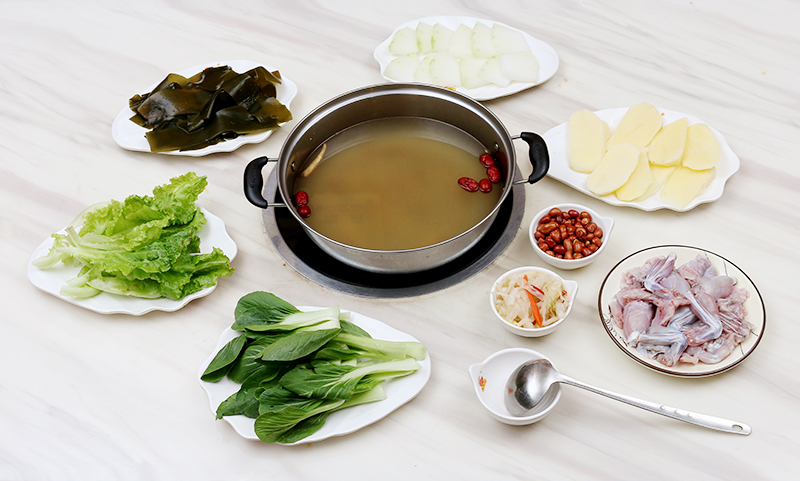 牛蛙兩只、送蔬菜五盤、小菜二碟、米飯隨意,純天然名貴食材熬制成湯??焖?、衛(wèi)生,讓您在享受美味的同時,滋補您的身體。